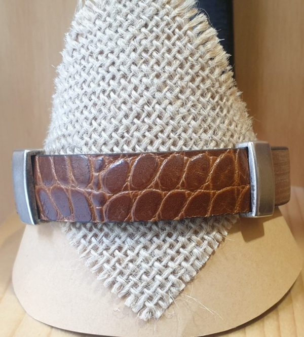 pulsera de dos cueros diferentes planos anchos con pieza de zamak, cierre de imán.