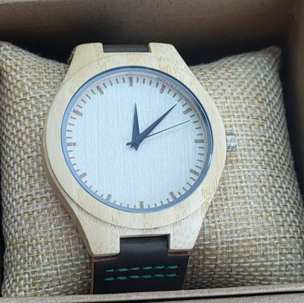 Reloj con esfera de madera en color claro, fondo claro, correa de piel en color marrón.