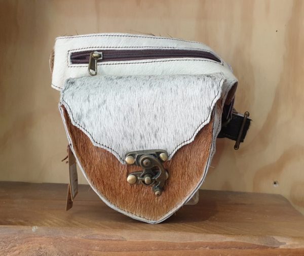 Riñonera de piel animal print pintada en tonos blancos, y marrones, ajustable a la cintura, dos bolsitos en la parte anterior uno de ellos con cierre de cremallera y otro con cierre de ancla y otro bolsito en la parte posterior con cierre de cremallera. Ver forma en galería se fotos.